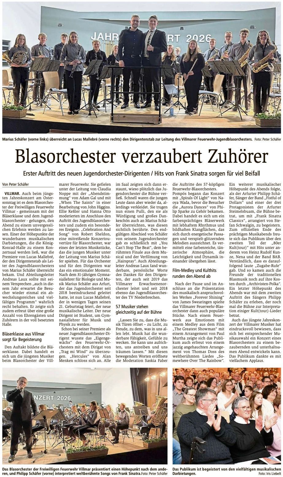 Das Blasorchesters der Freiwilligen Feuerwehr Villmar lädt herzlich zu seinem mit Spannung erwarteten Jahreskonzert ein, das am 05. April 2026 um 19:30 Uhr in der König-Konrad-Halle stattfinden wird. Auch in diesem Jahr erwartet die Besucherinnen und Besucher wieder einmal ein abwechslungsreiches und vielfältiges Programm. Eröffnet wird das Konzert mit Spirals of light von Naoya Wada bevor die Zuhörerinnen und Zuhörer die Aurora Dances von Philip Sparke zu Gehör bekommen. Aurora Dances ist ein farbenprächtiges Bläserwerk mit lebhaftem Rhythmus und bildhaften Klangflächen, das sich durch energetische Passagen und verspielt-glitzernde Melodien auszeichnet. Es vermittelt eine farbenreiche, tänzerische Atmosphäre, die Leichtigkeit und Dynamik ineinander übergehen lässt. Nach einer kurzen Pause dürfen sich die Besucherinnen und Besucher auf The Greatest Showman freuen, ein Medley mit den schönsten Melodien aus dem gleichnamigen Film. Ein weiteres Highlight des Konzertprogramms ist das Stück Frank Sinatra Classics, bei dem das Blasorchester gemeinsam mit dem Sänger Phillip Schäfer die zeitlosen Hits Sinatras präsentieren. Auch die Freunde der traditionellen Blasmusik kommen auf ihre Kosten. Zudem dürfen sich die Besucherinnen und Besucher auf weitere musikalische Highlights gefasst machen. Das Konzert wird traditionell von den jungen Musikerinnen und Musikern des Jugendblasorchesters, unter der Leitung von Marius Schäfer, eröffnet. Ebenso wird die Bläserklasse wieder ihr Können unter Beweis stellen. Auch in diesem Jahr lädt das Orchester vor Beginn des Konzerts zu einem Sektempfang im Foyer der König-Konrad-Halle ein. Im Kartenpreis (10,- € VVK; 12,- € AK) ist bereits ein Glas Sekt inbegriffen. Karten sind ab sofort erhältlich und können bei der Bäckerei Schmidt, dem Schuhhaus Bleul, in der Lahn-Apotheke in Villmar sowie an der Abendkasse erworben werden. Seien Sie dabei und lassen Sie sich von der musikalischen Vielfalt und der Leidenschaft des Blasorchesters der Freiwilligen Feuerwehr Villmar begeistern! Wir freuen uns auf Ihr Kommen!